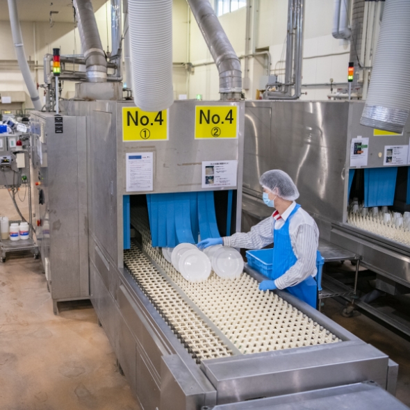 航空機到着後に取卸したカート類は、当社の洗浄エリアに搬入され、食器やカトラリーは細かいチェックのもと洗浄されています。汚れ具合にあわせ、つけ置き洗い、手洗いも行っています。